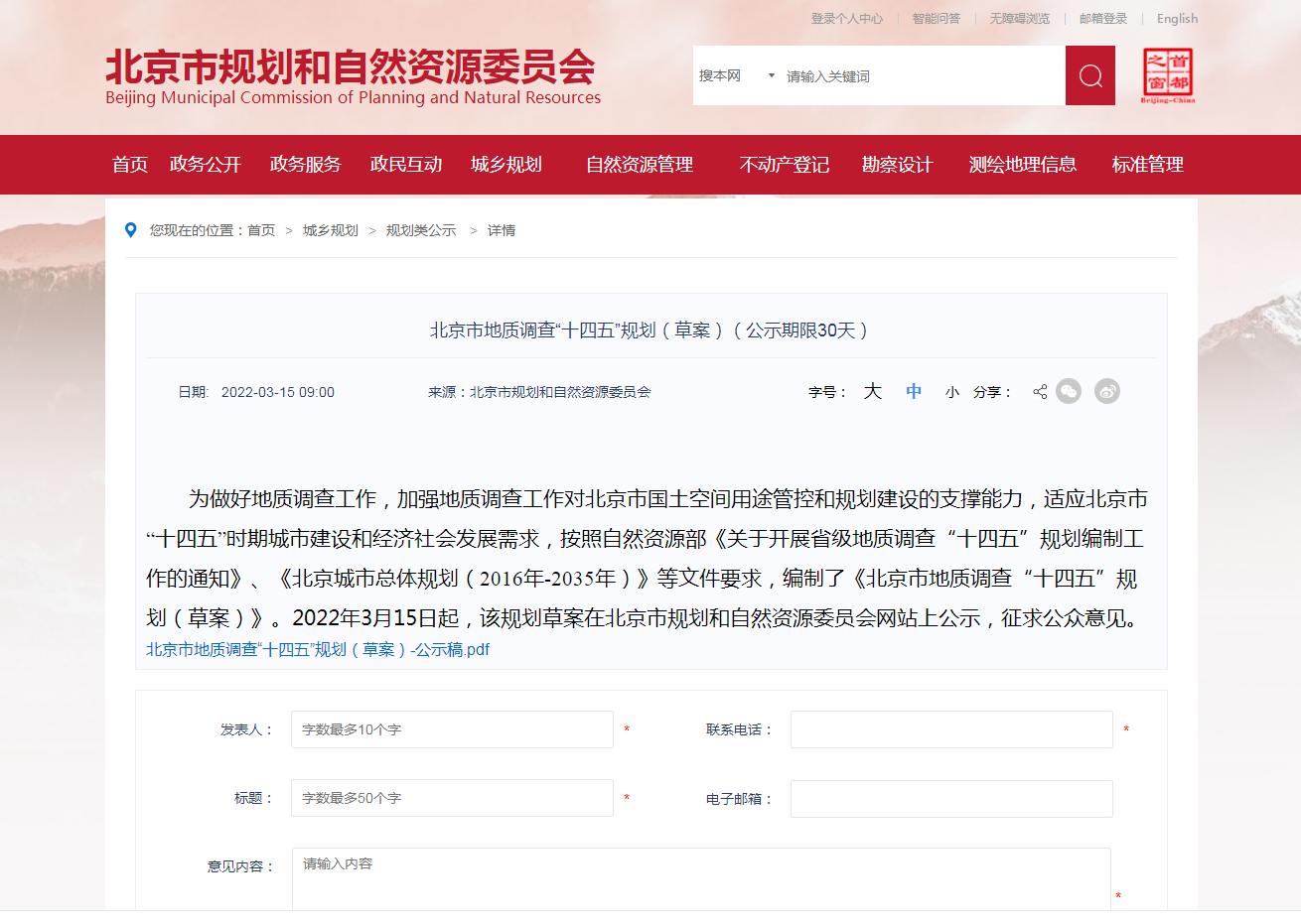 地大熱能地熱+多能互補網訊:《北京市地質調查“十四五”規劃(2021—2025年)(草案)》(以下簡稱《草案》)3月15日起在市規劃自然資源委網站公示,聽取公眾意見,公示期30天。《規劃》提出,北京市將率先對首都功能核心區地熱能等開展綜合地質調查評價,提供地質安全保障。社會公眾對該《規劃》如有意見建議,可在4月14日前登錄北京市規劃自然資源委網站留言。