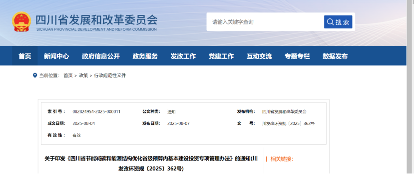 8月7日,四川省發展和改革委員會發布關于印發《四川省節能減碳和能源結構優化省級預算內基本建設投資專項管理辦法》的通知(川發改環資規〔2025〕362號)。