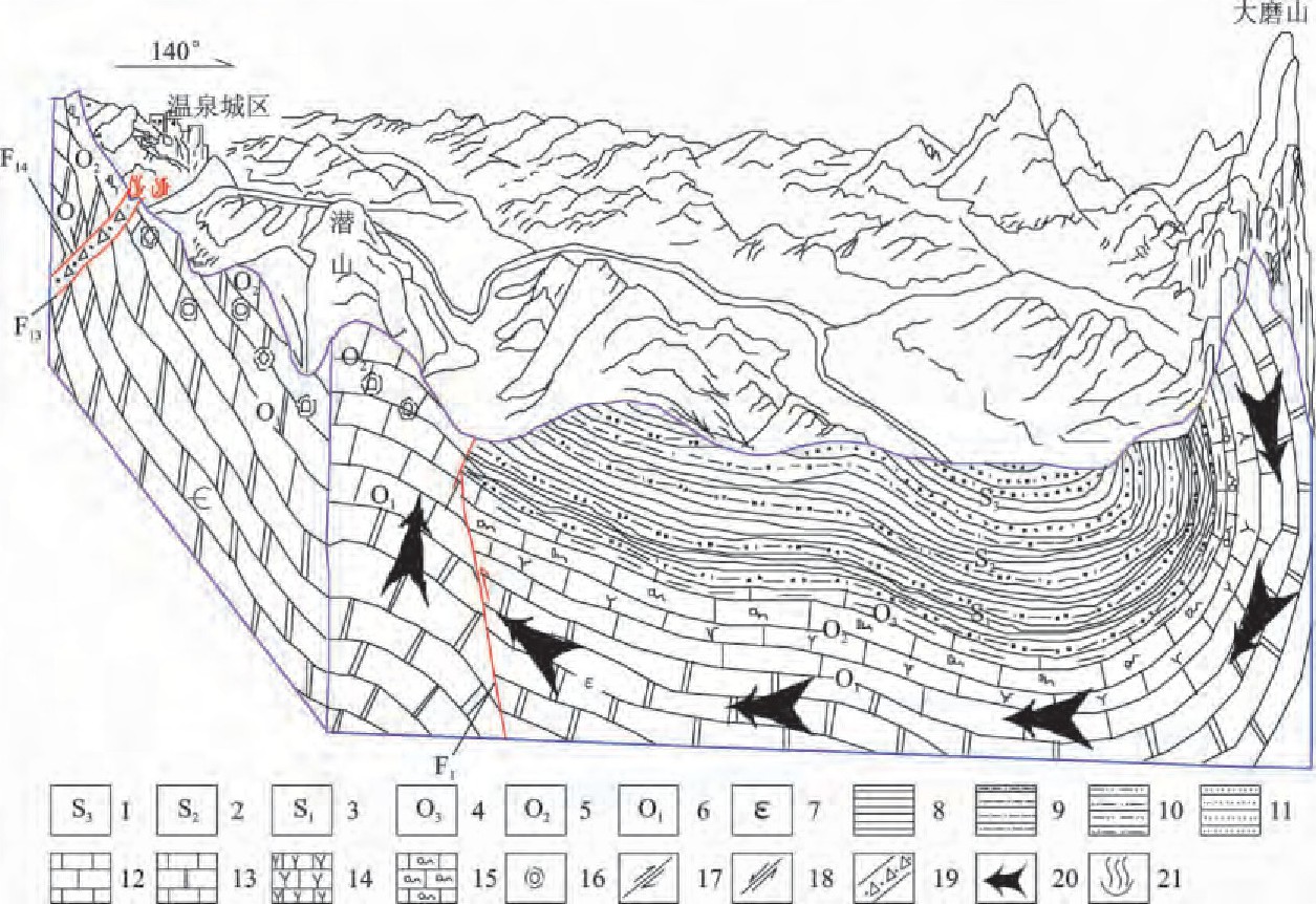 咸寧地質(zhì)構(gòu)造位置處于揚(yáng)子準(zhǔn)地臺(tái)梁子湖坳陷與咸寧臺(tái)褶束的交接部位,從屬于大幕山復(fù)式背斜北翼的次級(jí)構(gòu)造—高橋向斜、孫鑒鋪倒轉(zhuǎn)背斜、賈家山倒轉(zhuǎn)向斜的西延部分,由一系列的緊密褶皺組成區(qū)內(nèi)的基本構(gòu)造骨架。新華夏晚期構(gòu)造體系在潛山一帶表現(xiàn)強(qiáng)烈,其中大義山式斷裂有明顯的反映。這些不同的構(gòu)造體系互相干擾、復(fù)合,不僅控制了區(qū)內(nèi)的巖性組合、地貌、巖溶發(fā)育,而且也嚴(yán)格控制了地下水的分布及其補(bǔ)給、運(yùn)移和排泄。潛山背斜是地?zé)崽?/a>的主要構(gòu)造骨架,其特點(diǎn)是呈梳狀,且向南東倒轉(zhuǎn),區(qū)內(nèi)溫泉斷裂規(guī)模最大,且是經(jīng)過多次構(gòu)造變動(dòng)的復(fù)合性斷裂,先期為縱張斷裂且以垂直運(yùn)動(dòng)為主,后期表現(xiàn)為逆向復(fù)合,并受逆時(shí)針的應(yīng)力作用而顯壓扭性特征,是深切割斷裂,也是控制區(qū)內(nèi)地?zé)崃黧w分布的主要斷裂。
