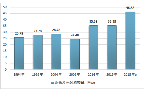 截止2018年年底,中國(guó)地區(qū)地?zé)岚l(fā)電累計(jì)裝機(jī)約46.38MWe。