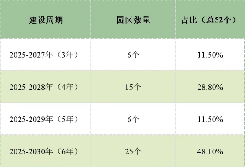 25個園區(qū)選擇6年建設(shè)周期(2025-2030年),占比接近50%。園區(qū)零碳轉(zhuǎn)型需要經(jīng)歷碳排放核算摸清底數(shù)、產(chǎn)業(yè)結(jié)構(gòu)優(yōu)化升級、清潔能源全面替代等全流程,尤其是石化、鋼鐵、有色金屬等傳統(tǒng)高耗能園區(qū),轉(zhuǎn)型難度大、涉及環(huán)節(jié)多,必須給予充足的時間窗口持續(xù)推進(jìn)。